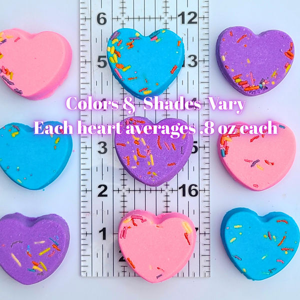 Quantity/color of your choice! Each Small Heart (.8 oz each) with ALL-Natural sprinkles (sprinkles themselves don't contain dyes!! Please note I use Lakes/Dyes that are batch certified for the actual Bath Bomb)! Tag includes; directions, ingredients, liability, batch number, and store information!